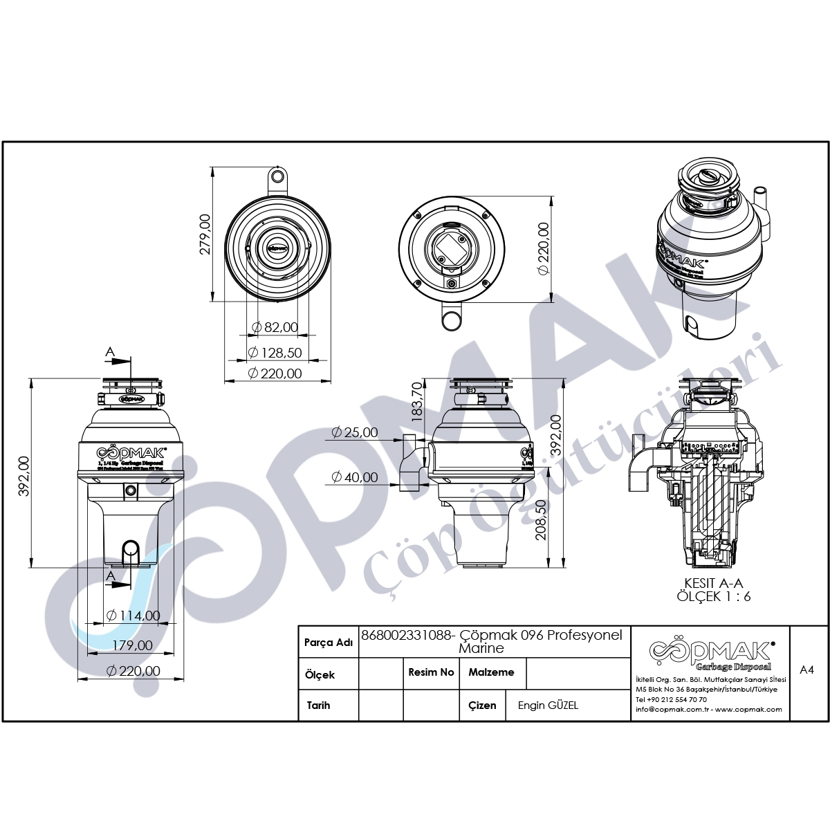 Ölçüler: Çöp giriş ağzı 90mm paslanmaz ve 50 mm çapında pis su tahliyesi, ağırlık 6 kg